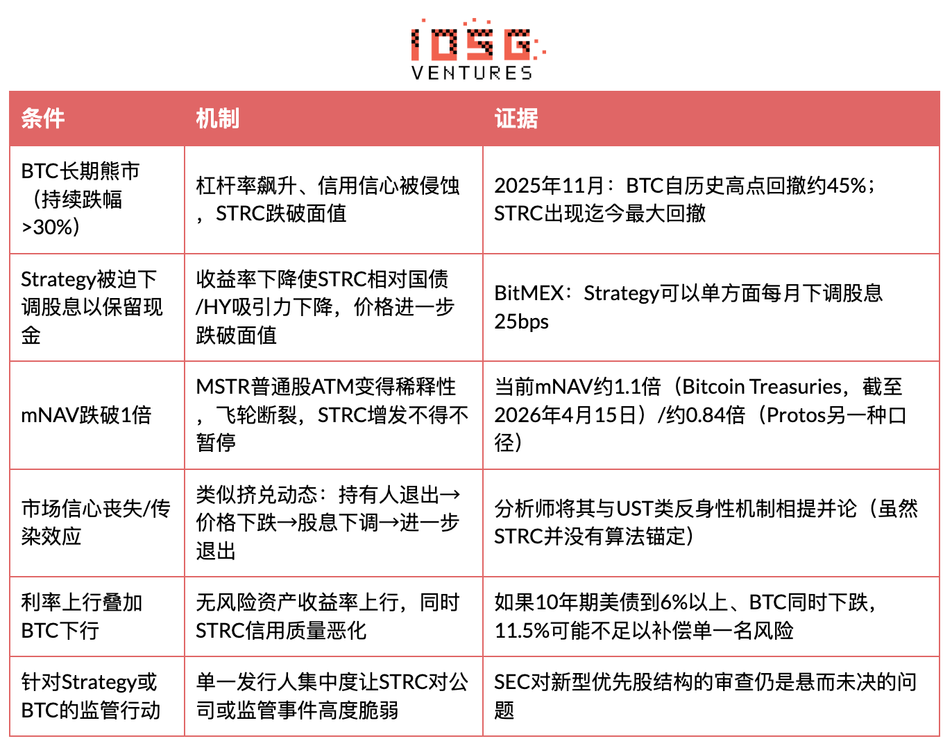 此為真正的斷點。Strategy 仰賴以高於 NAV 的價格發行 MSTR 普通股(mNAV > 1x)來購買 BTC 並去槓桿。若 BTC 深跌導致 mNAV 跌破 1 倍,普通股發行將稀釋現有股東價值,Saylor 將無法透過發行實現去槓桿。此時 Strategy 將面臨三難選擇:(a)繼續以更高股息率發行 STRC 並承受更高槓桿;(b)依 SEC 備案條款單方面調降股息(每月 25 bps),任由 STRC 價格下跌;(c)出售 BTC 於下跌市場中套現。